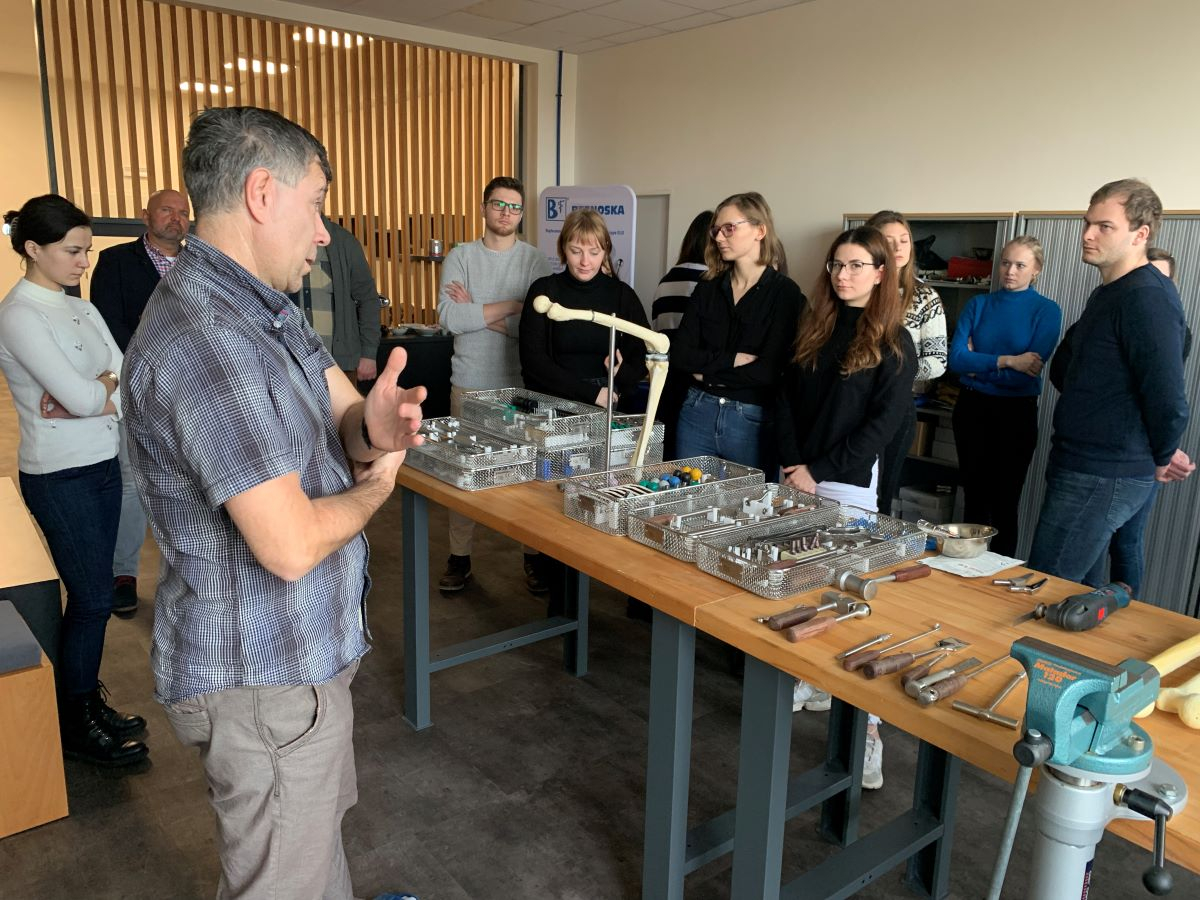 Ve firmě Beznoska se medici seznámili i s historií – vývojem technologie, od prvních po nejnověji vyráběné druhy chirurgických nástrojů a náhrad. Dozvěděli se i o stále se rozvíjející oblasti spojené s využitím 3D tisku. Kupříkladu pro vytvoření modelu náhrady části pánevní kosti. Nebo o implantátech, jejichž kompozitní materiál obsahující titanové kuličky je schopen „prorůst“ a stát se v podstatě součástí původní, vlastní tkáně pacienta.