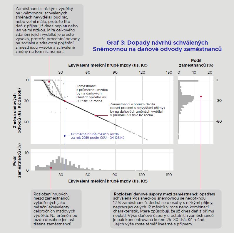 Další graf (Graf 3) zobrazuje dopady aktuálně schváleného návrhu Poslaneckou sněmovnou. „Tento graf si můžete představit jako plochu, na které jsou šedé kuličky reprezentující vždy jednoho daňového poplatníka. Když kuličky sesypete doprava, uvidíte distribuci daňové úspory mezi zaměstnanci,“ popisuje Šoltés a pokračuje: „Na prvním šedém sloupečku pravého grafu například vidíte, že na 12 procent obyvatel tyto navrhované změny nebudou mít vůbec žádný vliv.“ Jedná se o velmi různorodou skupinu lidí – o osoby s částečnými úvazky, osoby z různých důvodů nepracující celých 12 měsíců v roce (například kvůli dokončení studia, nástupu či ukončení mateřské a rodičovské dovolené či kvůli nezaměstnanosti) nebo kombinaci důvodů, které způsobují, že daň z příjmu neplatí. Zároveň ale platí sociální a zdravotní pojištění, které představuje zásadní část nákladů práce.