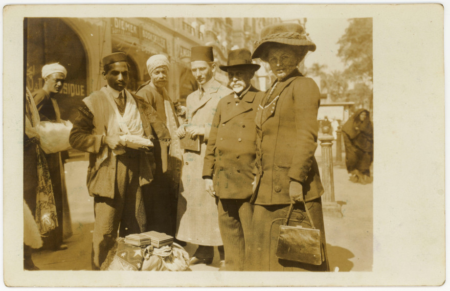 A. R. Nykl (třetí zprava) kupuje Korán jako suvenýr pro české turisty v Káhiře v roce 1911.