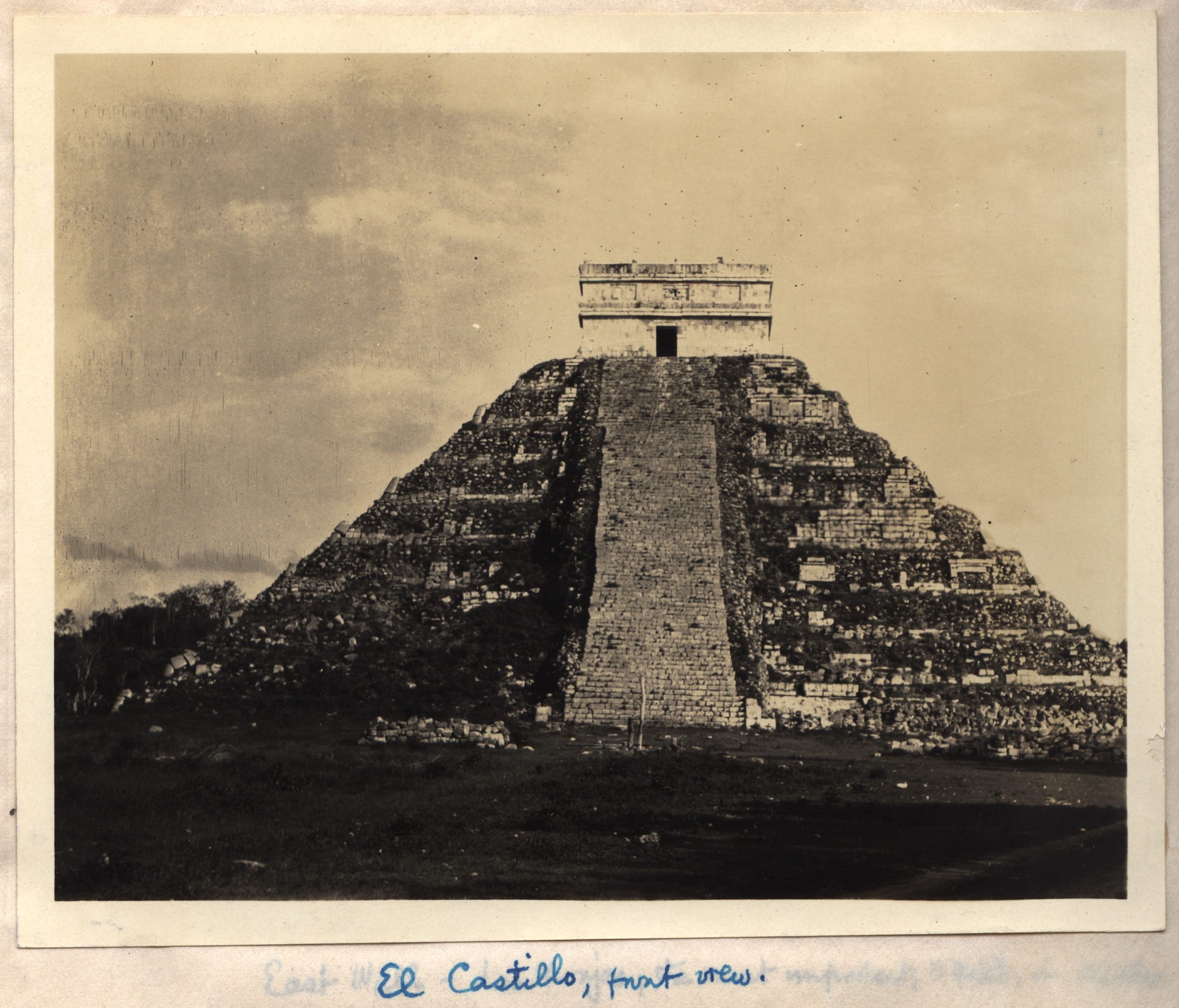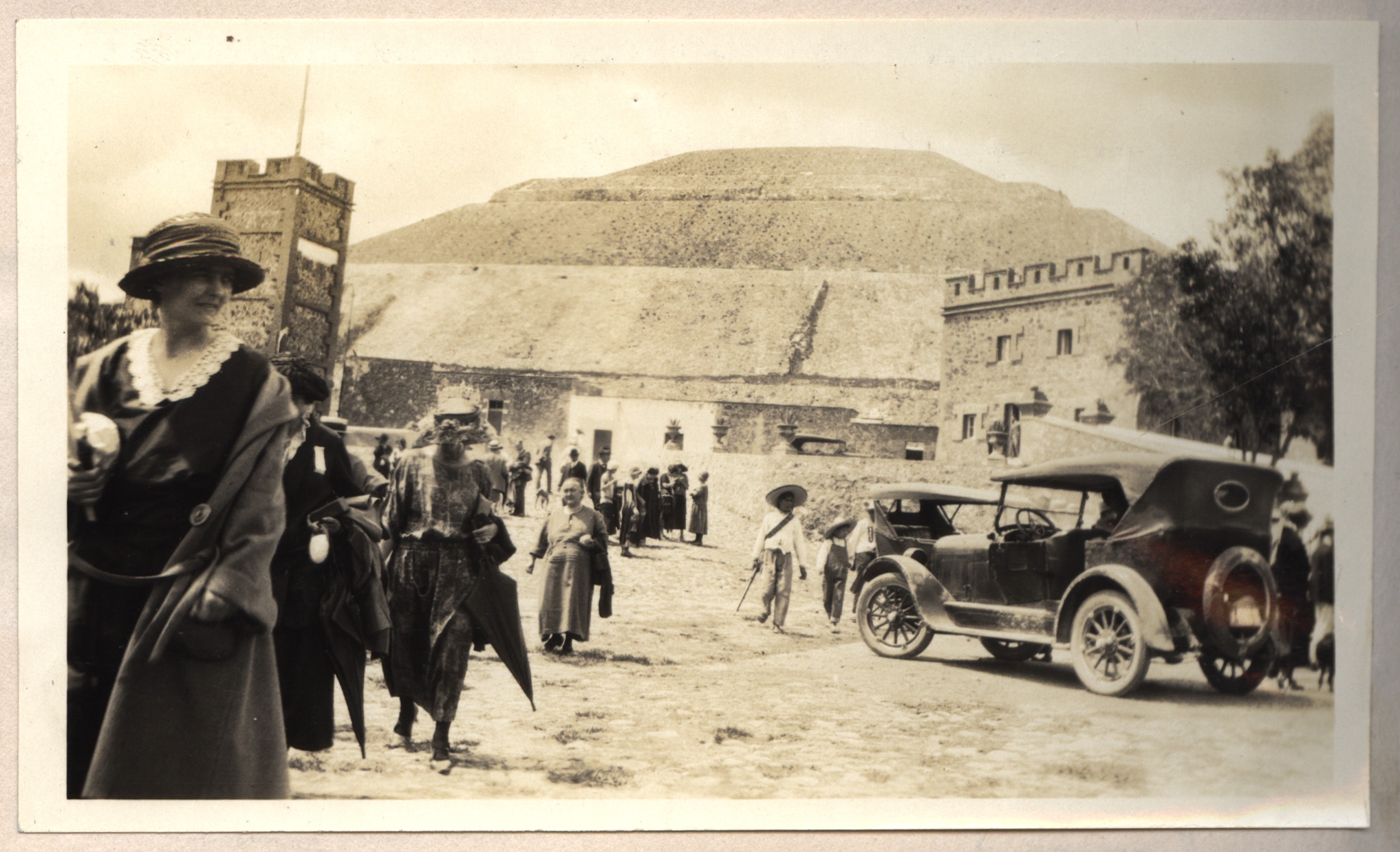 Dobová momentka turistů u pyramidy v mexickém Teotihuacánu (1925).