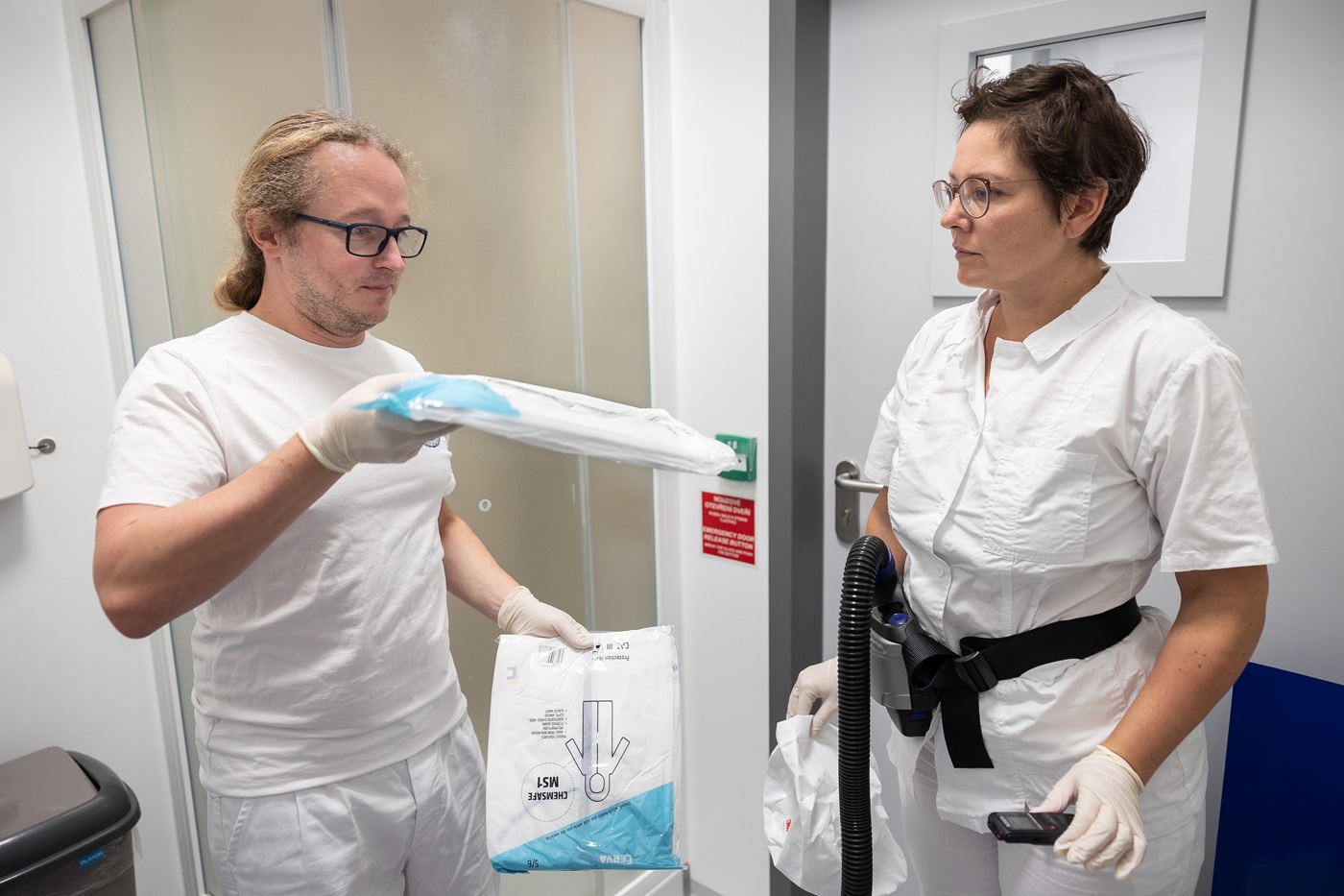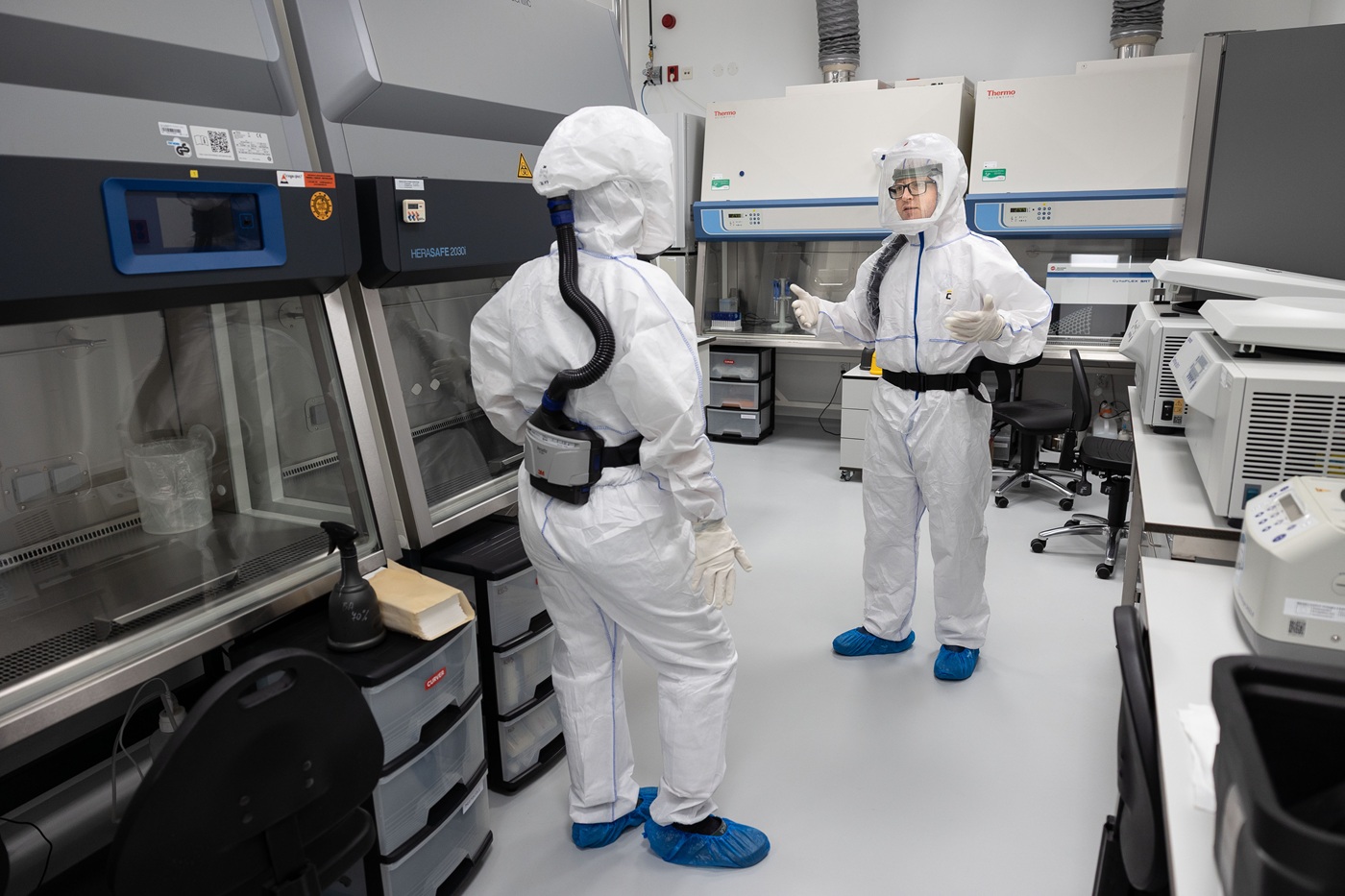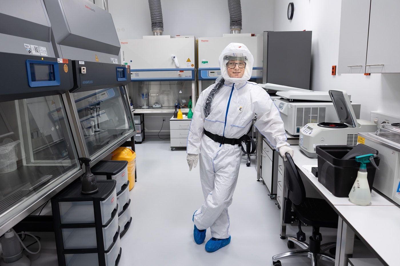 „Běžně pracujeme se SARS-CoV-2 nebo HIV. Máme ale i rukavicový box pro práci s ještě nebezpečnějšími původci onemocnění,“ říká Jiří Zahradník. Přístup sem mají jen vyškolení pracovníci. Každý nováček musí projít odborným školením, testem a zpočátku může pracovat jen pod dohledem zkušenějšího kolegy. V laboratoři může být maximálně šest lidí, obvykle ve dvojicích – kvůli bezpečnosti i přehledu. Mimo pracovní dobu a přítomnost personálu svítí na stropě germicidní lampy, které sterilizují prostor ultrafialovým světlem. Když je potřeba důkladnější čištění, laboratoř se uzavře a zaplní parami peroxidu vodíku. „Používáme osmiprocentní roztok, a to by vám klidně vybělilo tričko,“ směje se Jiří Zahradník.