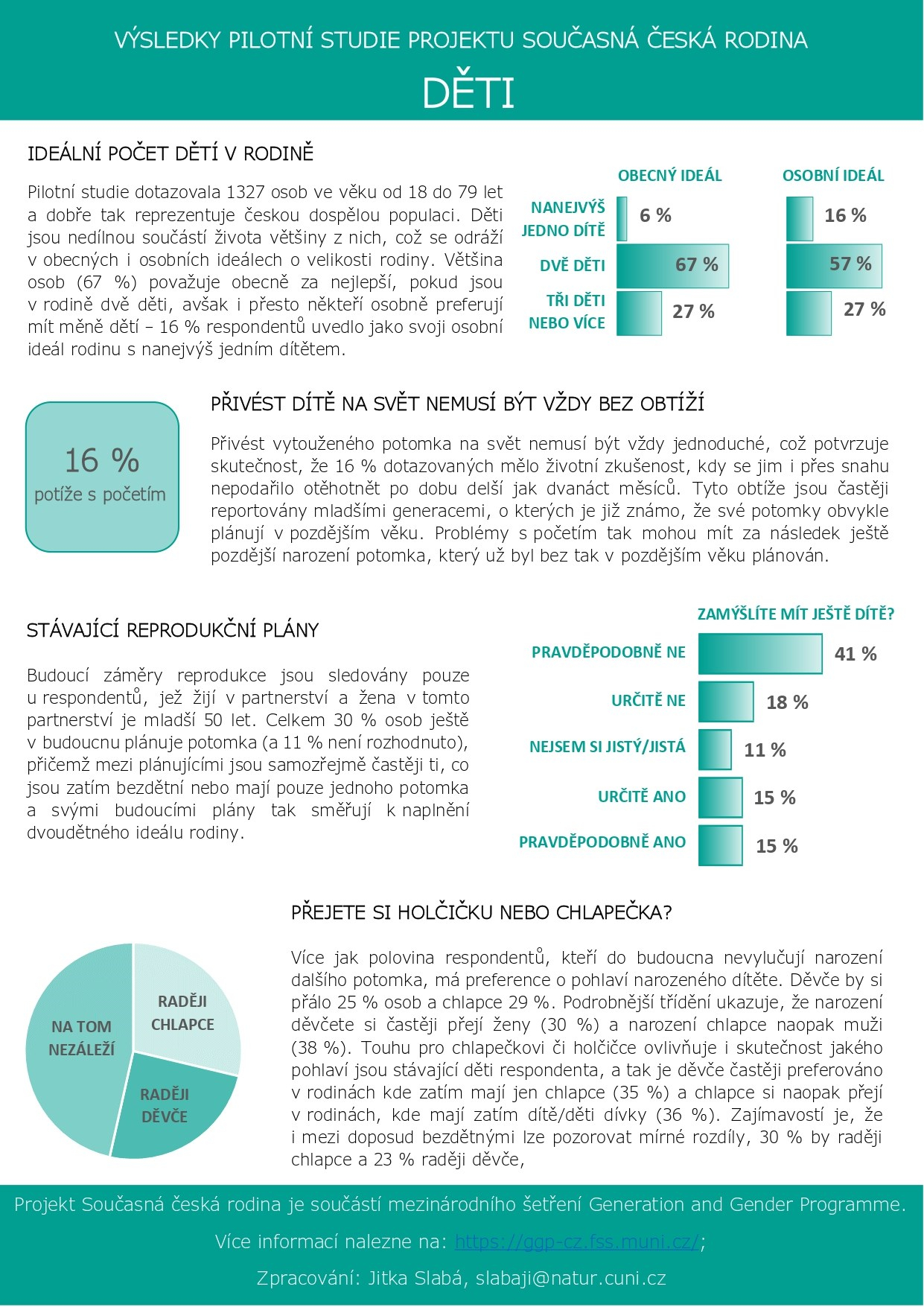 Důležitým zjištěním bylo, že reprodukční plány se během sledovaného období mezi prosincem 2020 a dubnem 2021 proměnily jen málo. Dokonce 91 procent respondentů uvedlo, že jejich přání ohledně plánovaného počtu dětí se nezměnila. Z respondentů, kteří plánují mít dítě, jich dvanáct procent uvedlo, že si vlivem pandemie přejí mít dítě později, než původně plánovali. Na druhou stranu deset procent uvedlo, že si přeje mít dítě dříve, nežli plánovali.