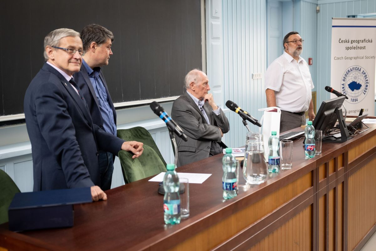 Než se posluchárna proměnila v dějiště poutavé diskuze, předal Smilovi plaketu České geografické společnosti její prezident Pavel Chromý.