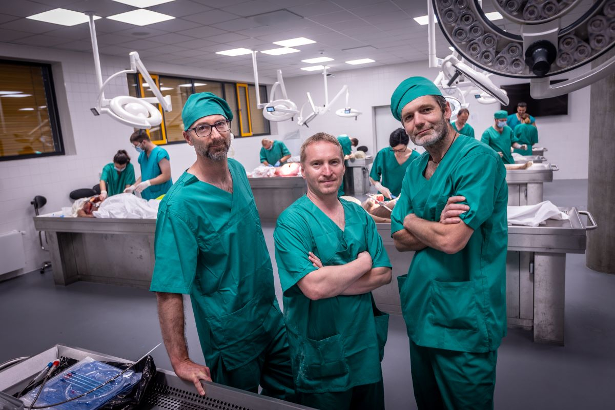 Zleva: Tomáš Haruštiak, Miroslav Durila a Martin Šnajdauf – základ týmu, který unikátní kurz traumatické resuscitační torakotomie na půdě „Dvojky“, tedy 2. lékařské fakulty UK, pro lékaře organizují