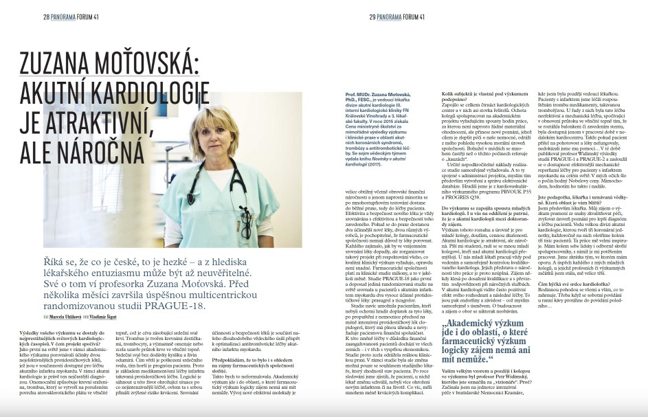 Kardioložka Zuzana Moťovská je doma na Kardiocentru Kardiologické kliniky 3. lékařské fakulty UK a Fakultní nemocnice Královské Vinohrady. Zde v rámci sehraného týmu divize akutní kardiologie léčí pacienty s kardiovaskulárním onemocněním, především infarktem myokardu, srdečním selháním, plicní embolií, arytmií. Sem, do pavilonu S, za ní přicházejí za výukou také medici – potenciální srdeční specialisté z Trojky. A přijít a ptát se renomované lékařky, pedagožky a vědkyně mohla i redaktorka magazínu Forum…